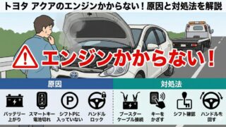 トヨタ アクアのエンジンかからないトラブルでお困りですか?原因は電池切れや簡単な操作ミスかも。この記事では、自分でできる確認方法からジャンプスタートの正しい手順、警告灯の意味まで徹底解説。あなたのトヨタ アクアのエンジンかからない悩みを解決します。